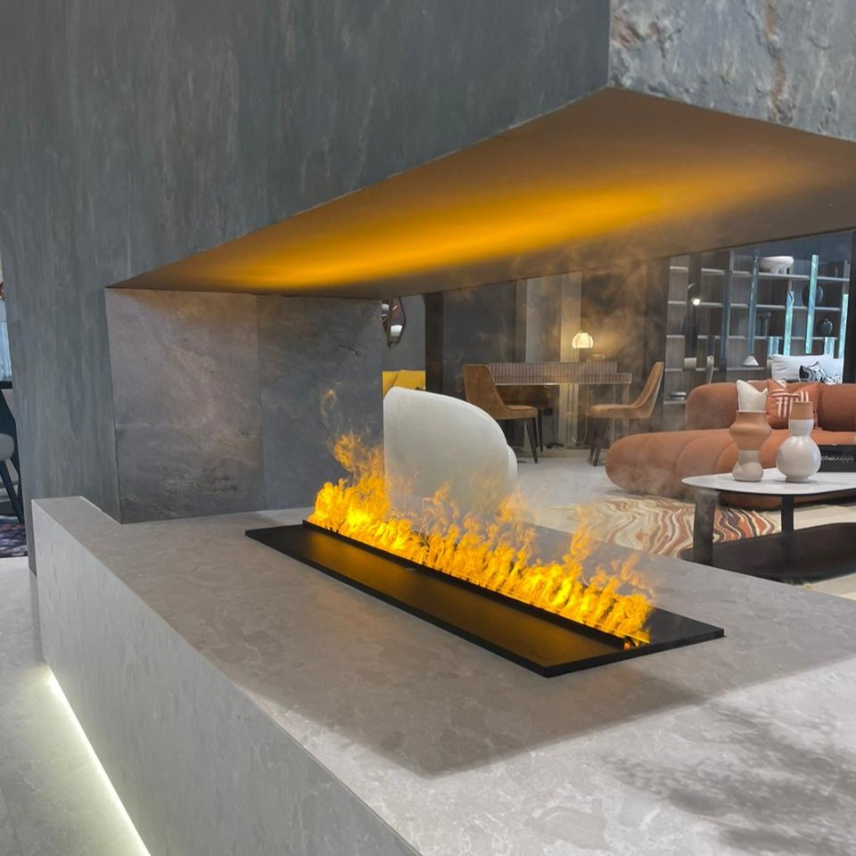The GlammFire Kit Glamm 3D Plus 500 brings dynamic flame realism to the Roche Bobois showroom in Morocco, blending modern luxury with architectural elegance.
